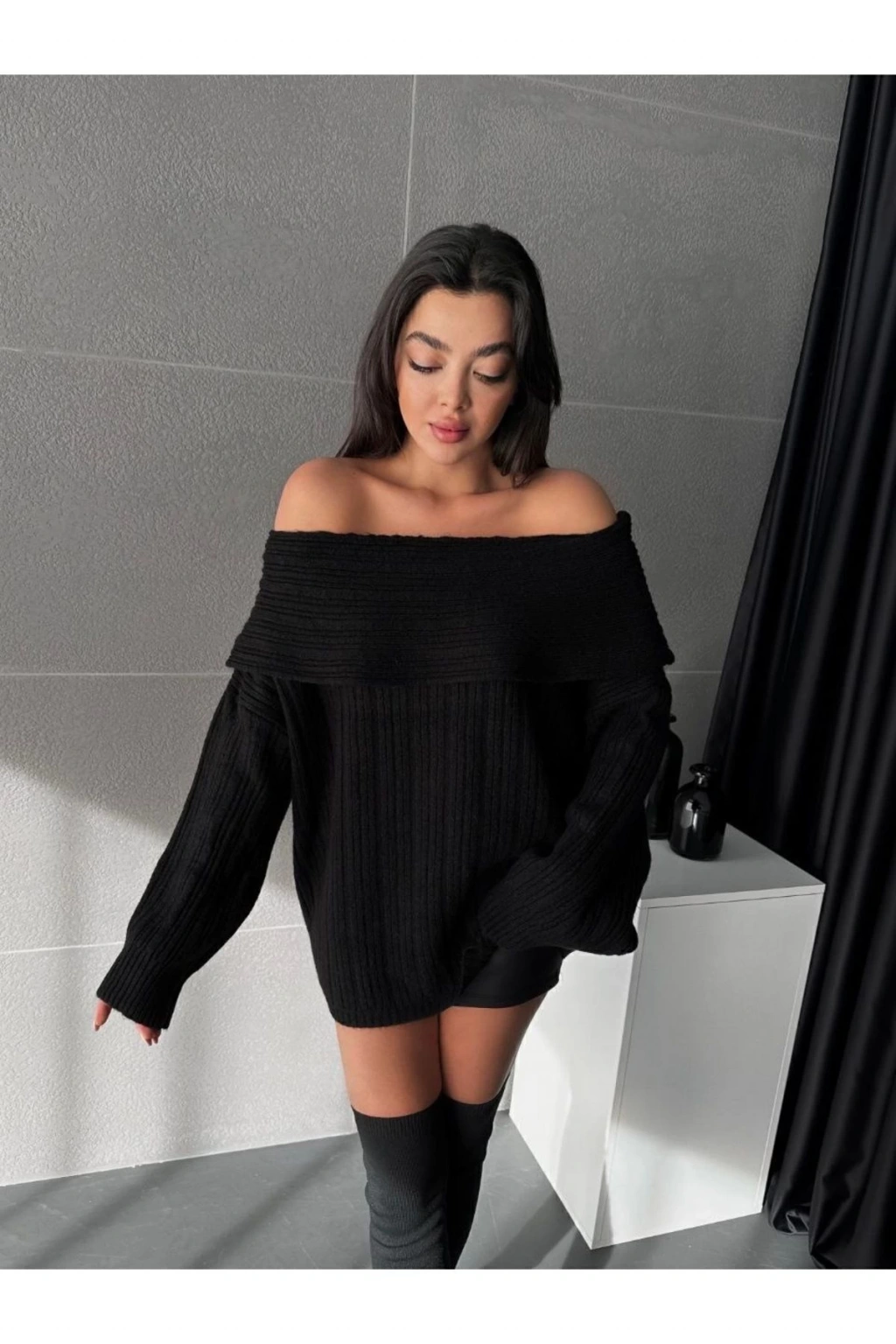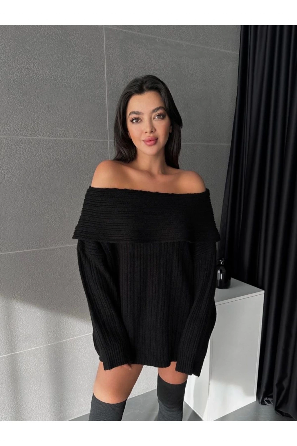 Siyah Kadin Omuzlari Açik Oversize Triko Kazak